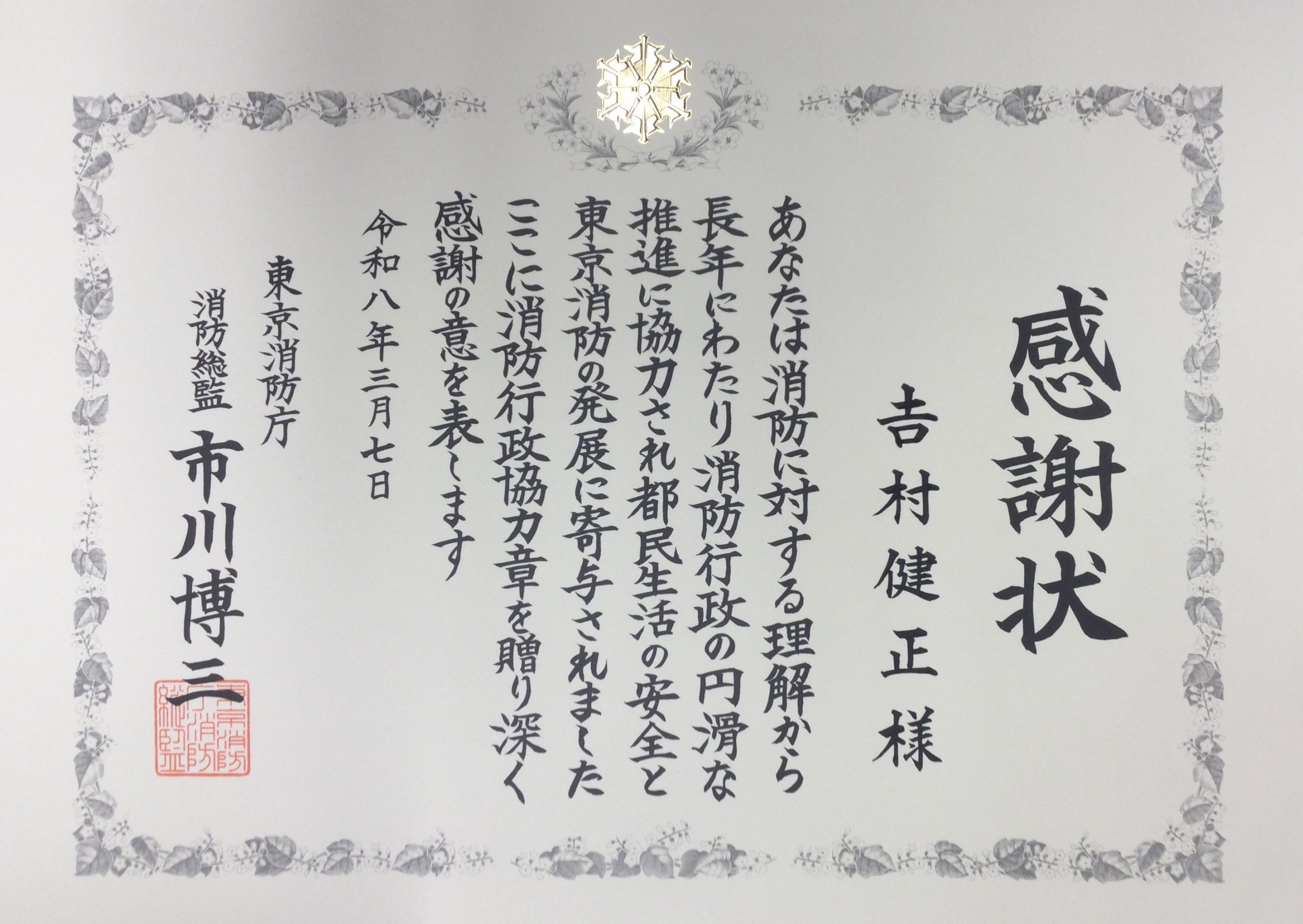 第78回東京消防庁開庁記念日に伴う消防行政協力章の伝達式が執り行われ、弊社の吉村会長が表彰を受けられました。